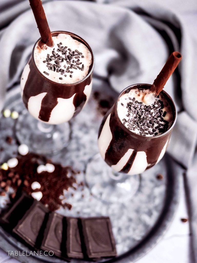 An indulgent creamy chocolate milkshake (cocktail) just for the Grown Ups, with Bailey’s Irish Cream, Kahlua, and Frangelico Liqueurs. A perfect way to help celebrate International Chocolate Day!