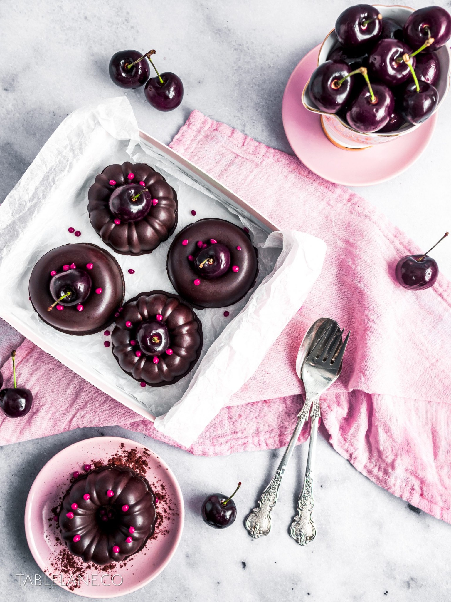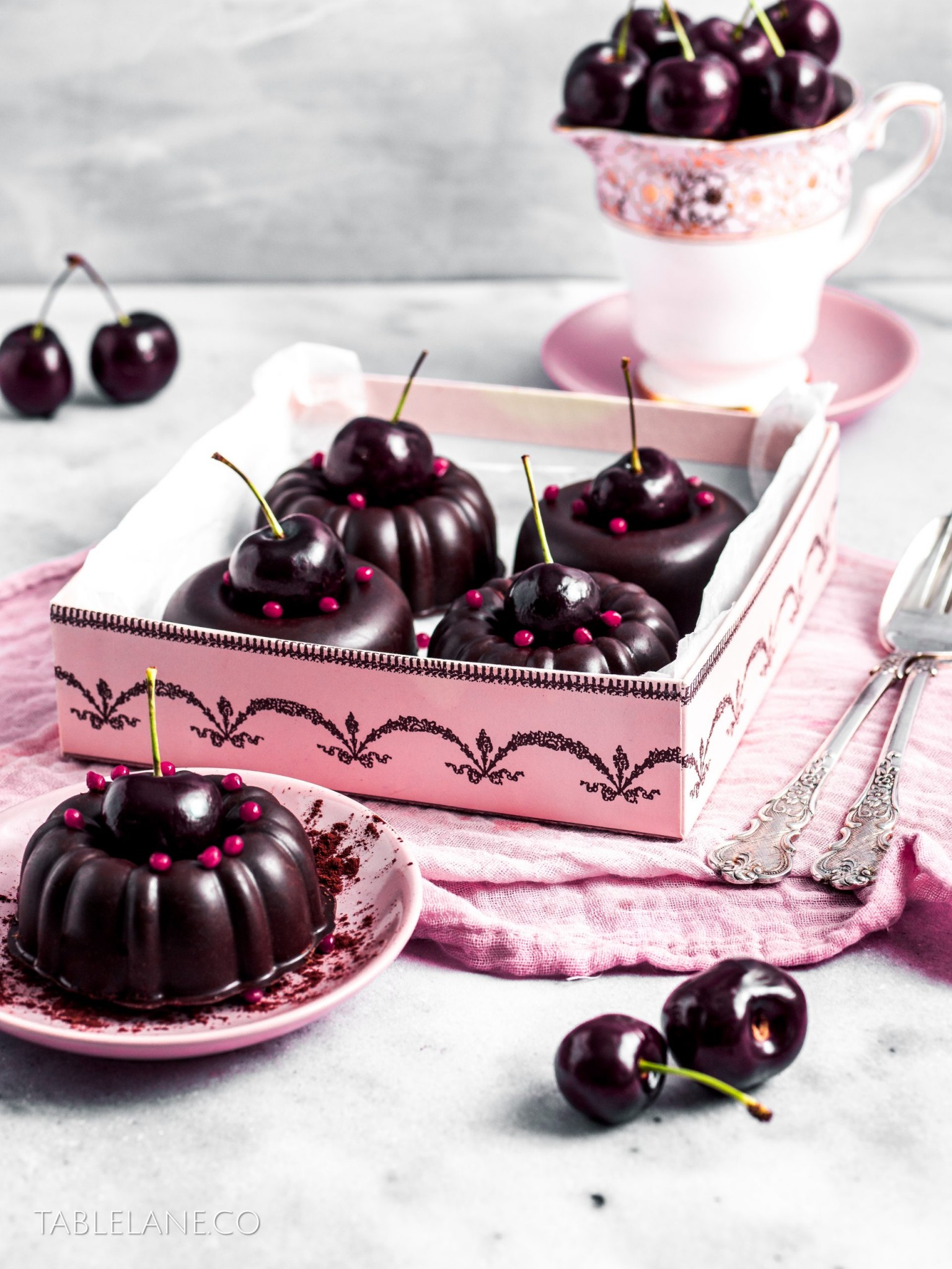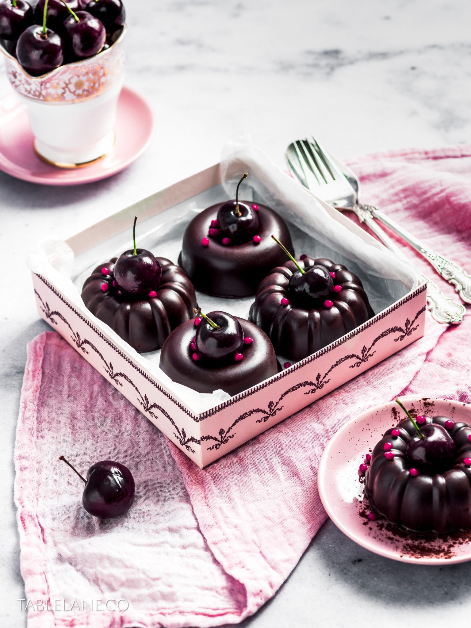 Make the desserts ahead of time, and serve them in cute boxes, dressed with some fresh shiny cherries, and pops of pink candy colour to fancy up any table setting.