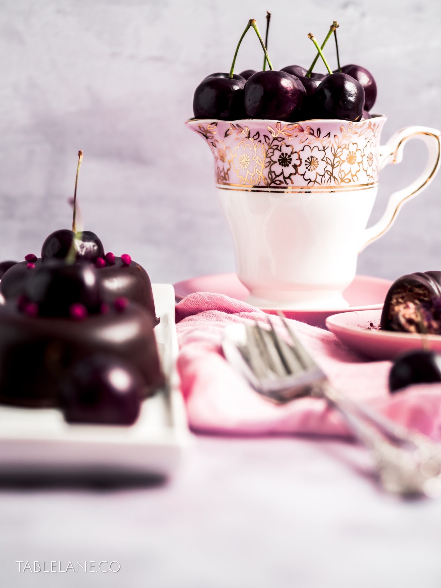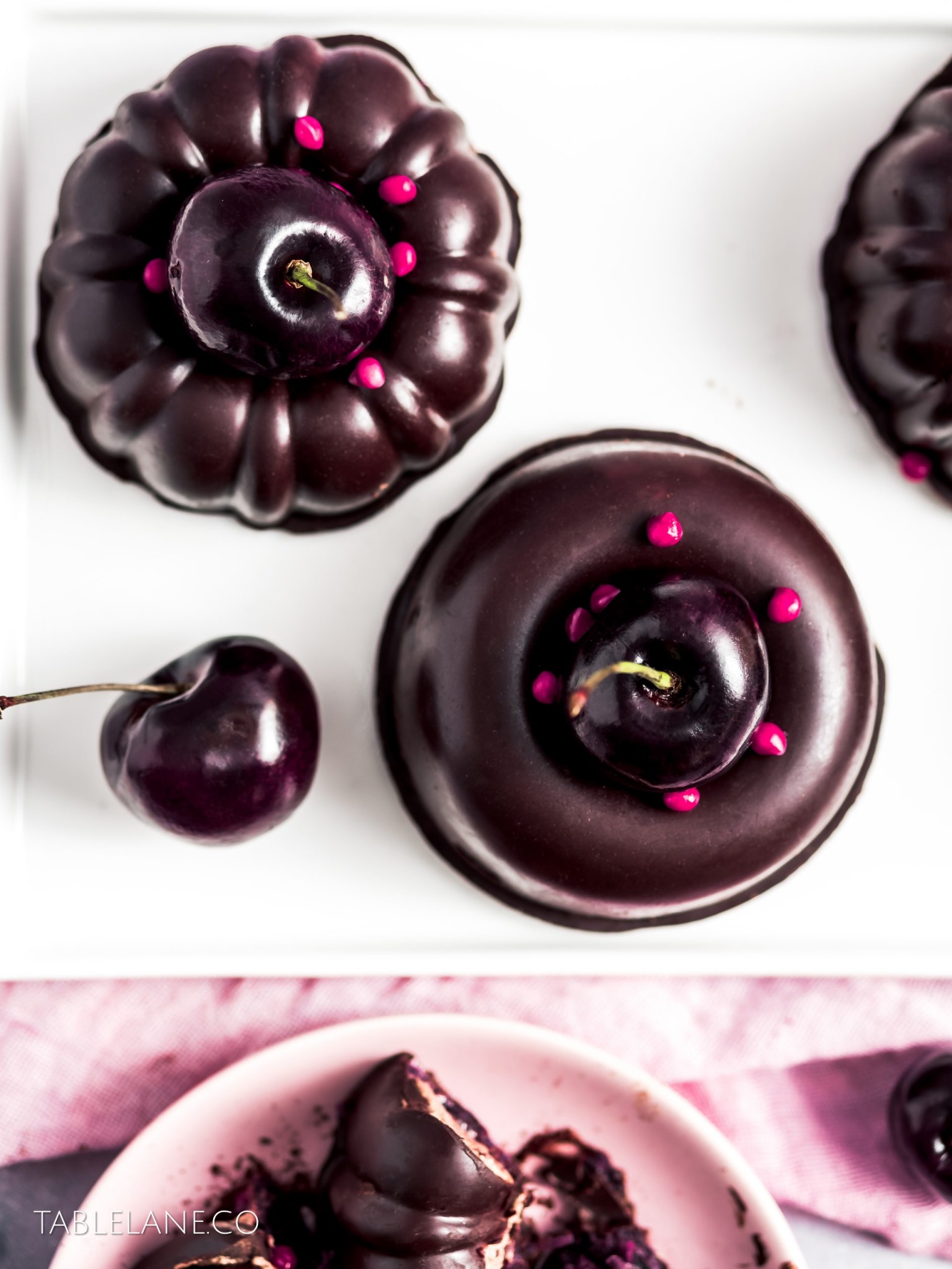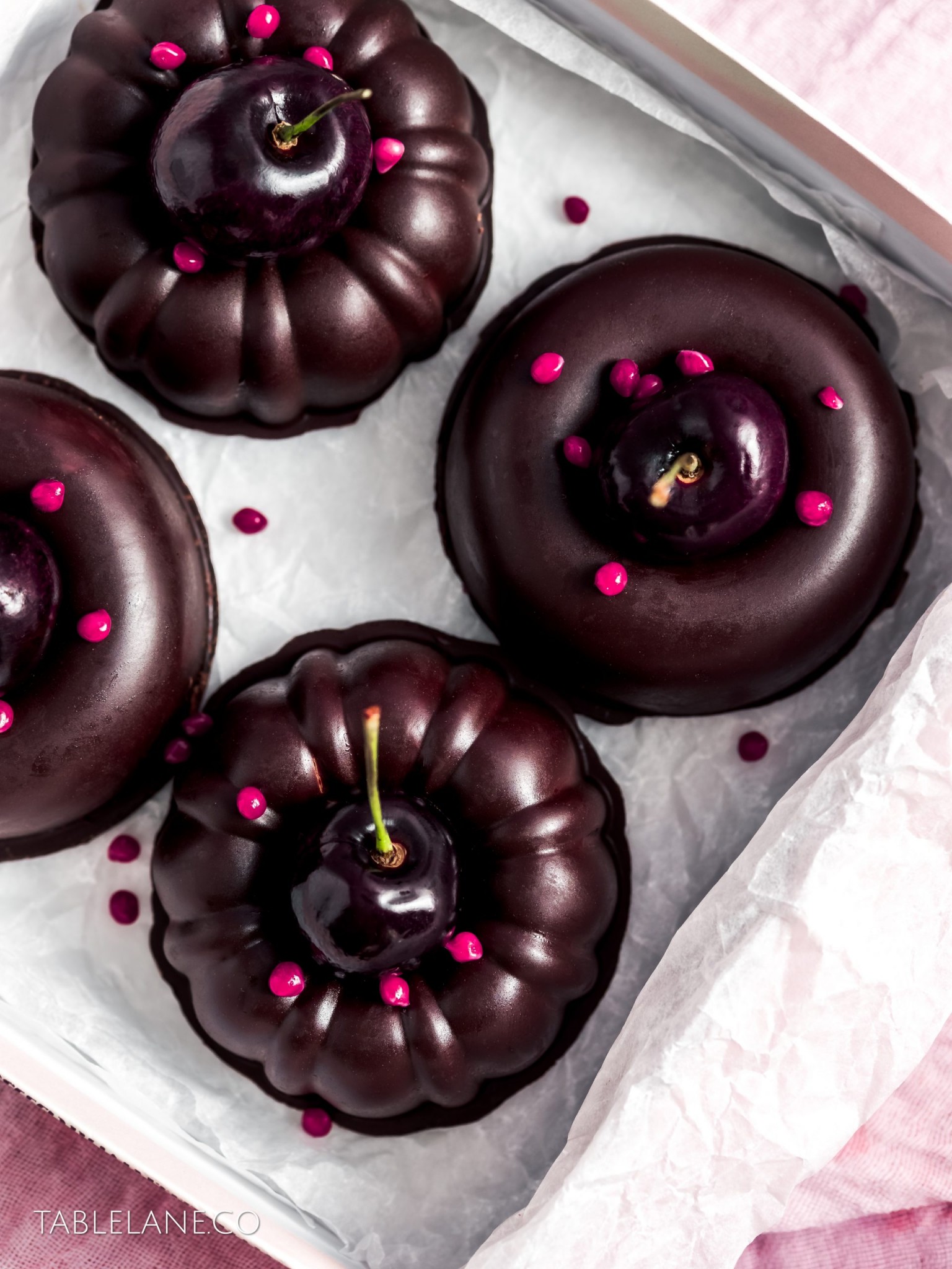Make the desserts ahead of time, and serve them in cute boxes, dressed with some fresh shiny cherries, and pops of pink candy colour to fancy up any table setting.