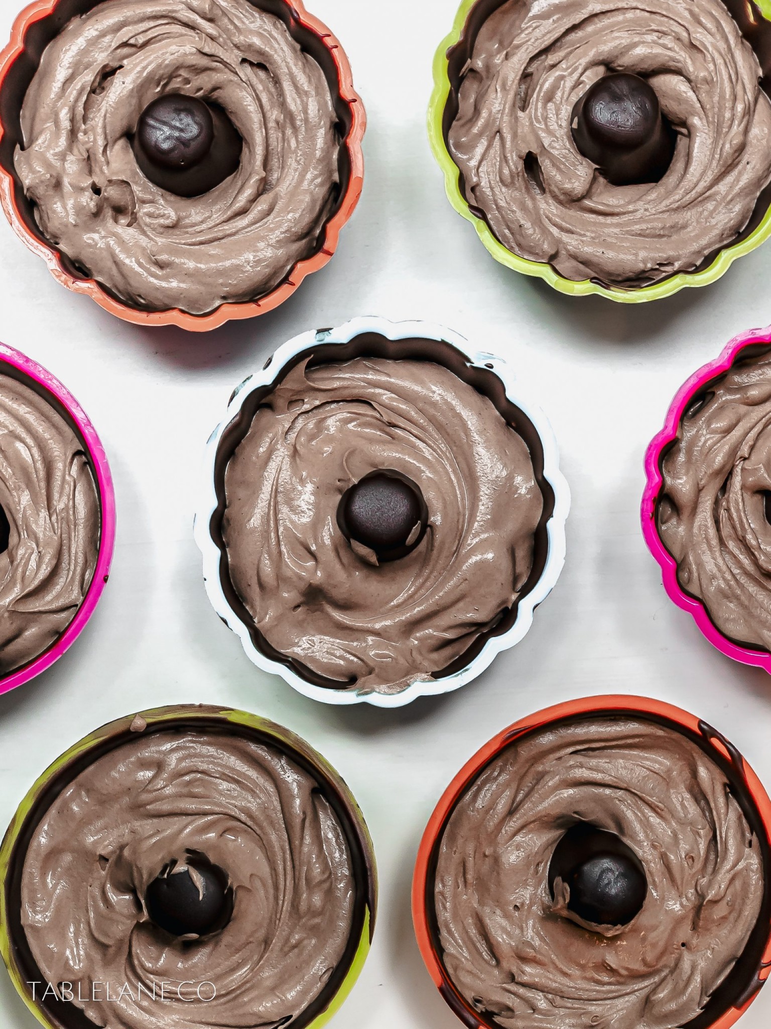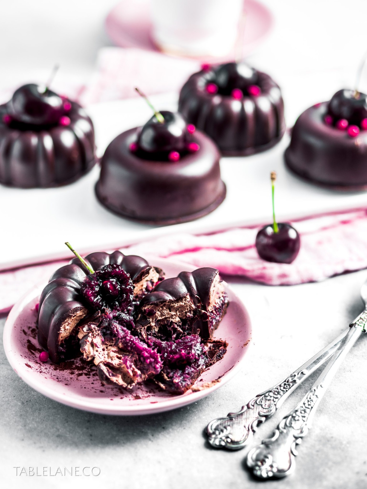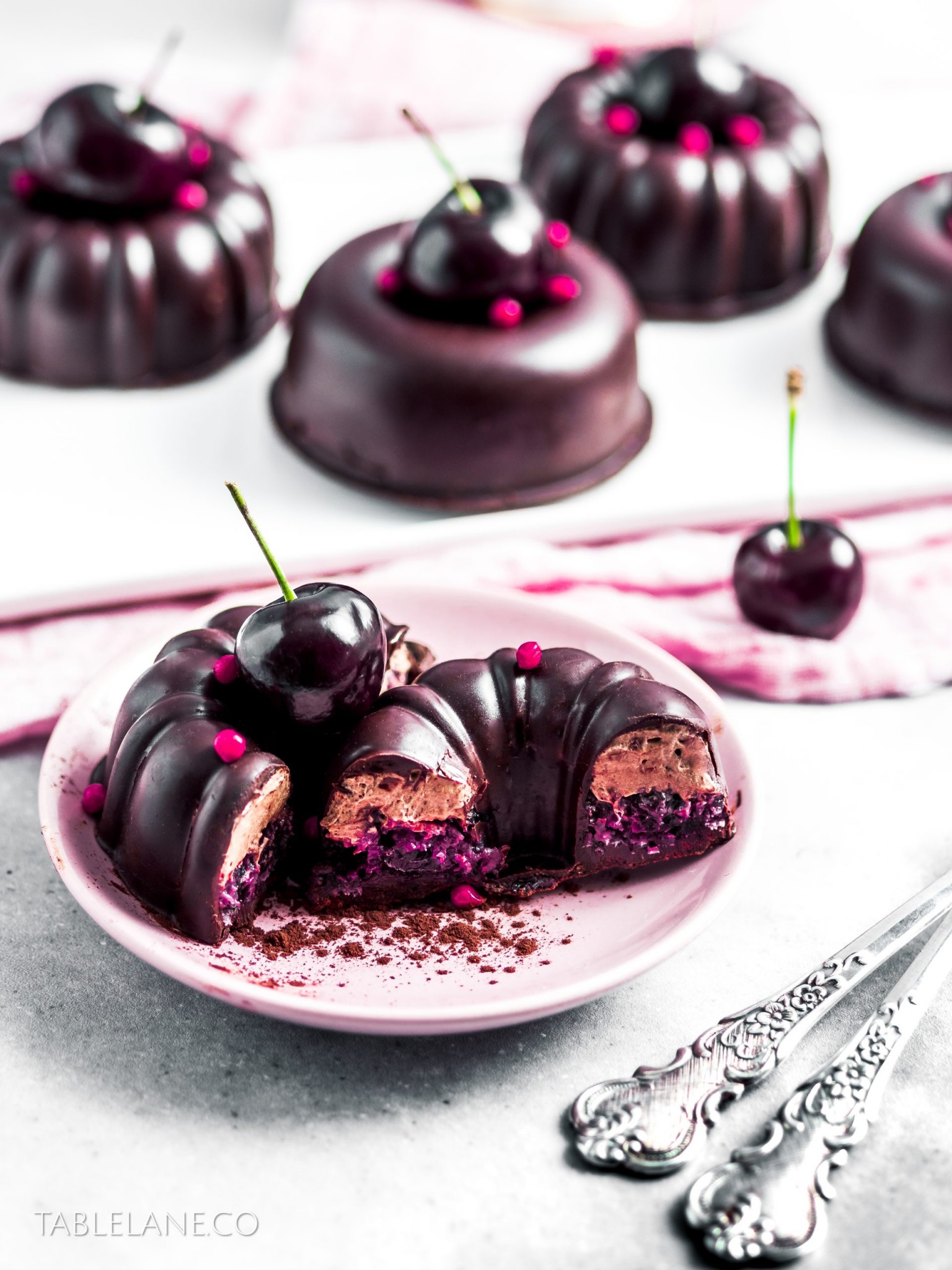 These chocolate Cherry Ripe inspired bundt desserts are a sure way to impress your guests. Filled with 2 inner layers of coconut and cherry, and a light and fluffy chocolate cream mousse then fully encased by a crisp dark chocolate shell.