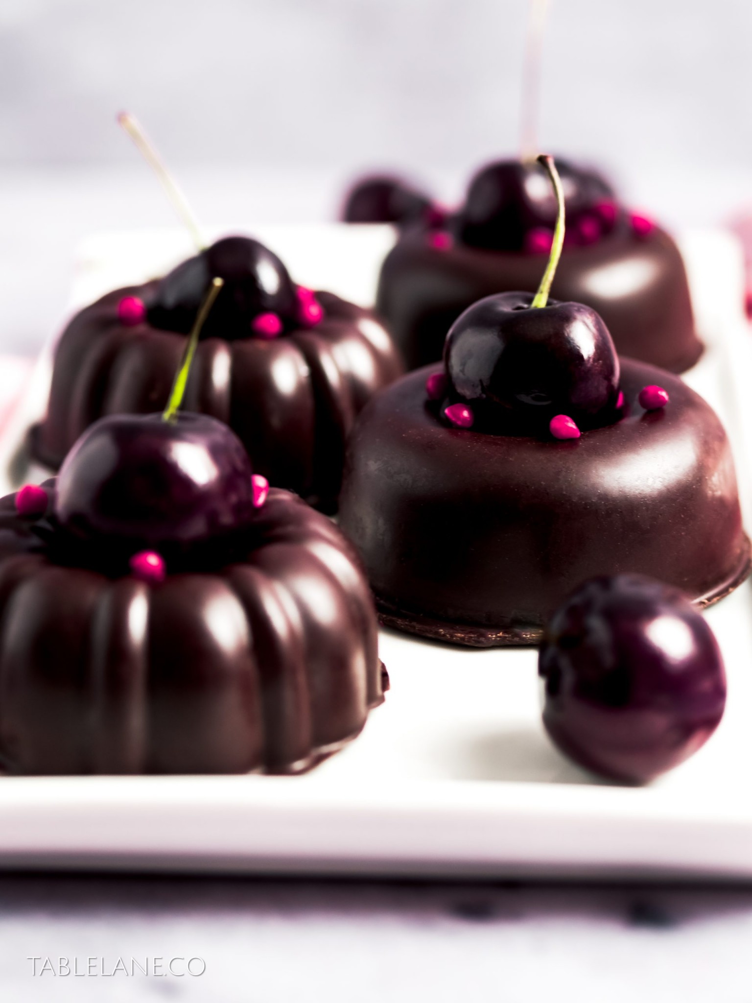 Serve the desserts in a fancy box, or on a plate of dusted cocoa powder, accompanied with fresh cherries, and any leftover chocolate cream mousse. Sprinkle with cherry flavoured pop candy for a splash of colour.