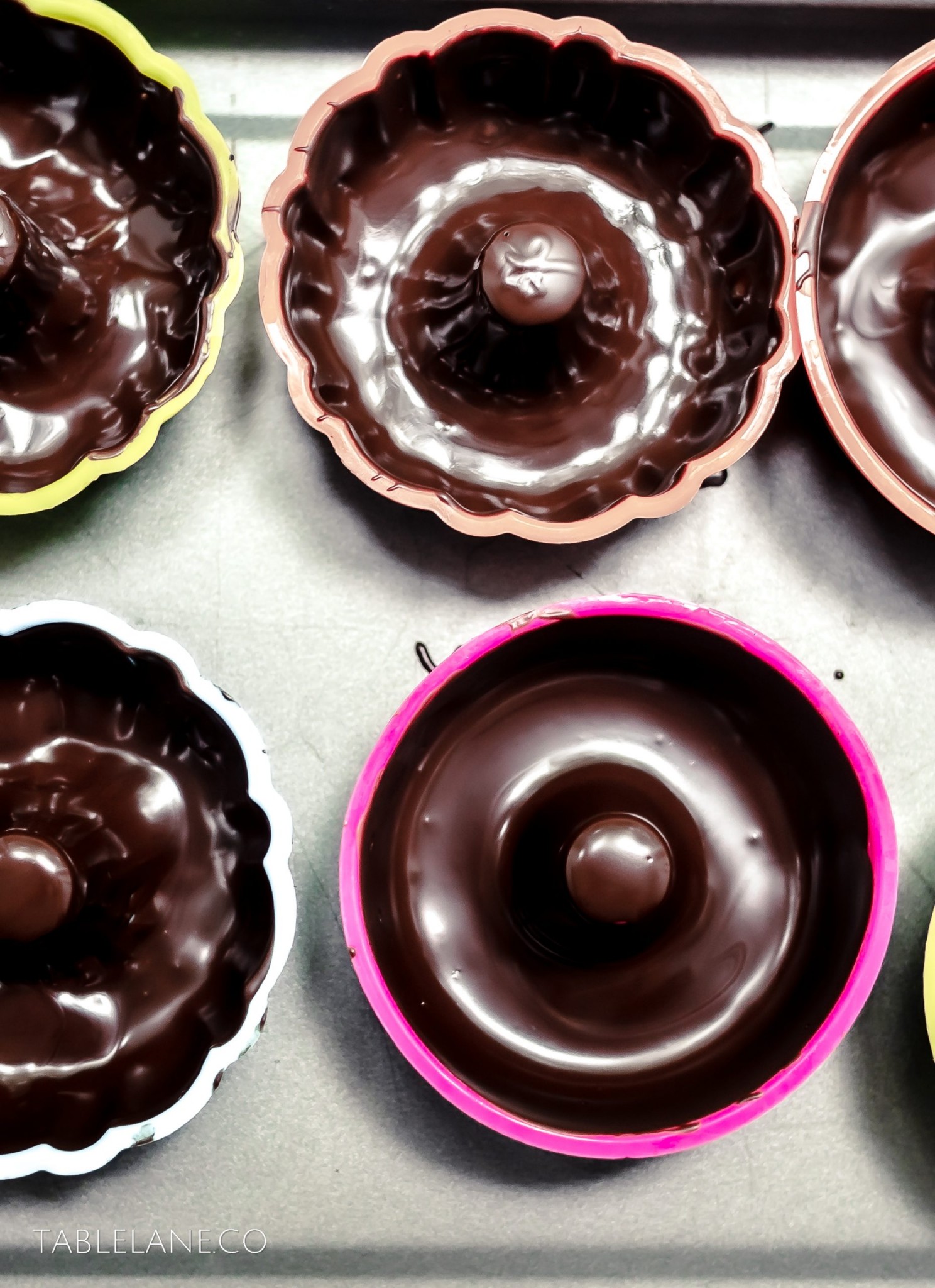 To remove the bundts from the moulds, make sure your hands or the room is not too warm.*4 Slowly and carefully peel back the edge of each mould, by first using the tip of a small knife to lift the silicon away from the chocolate edge. The mould should then peel back cleanly once started. Go slowly, and twist the center section rather than pull to ensure you dont damage the inner parts.