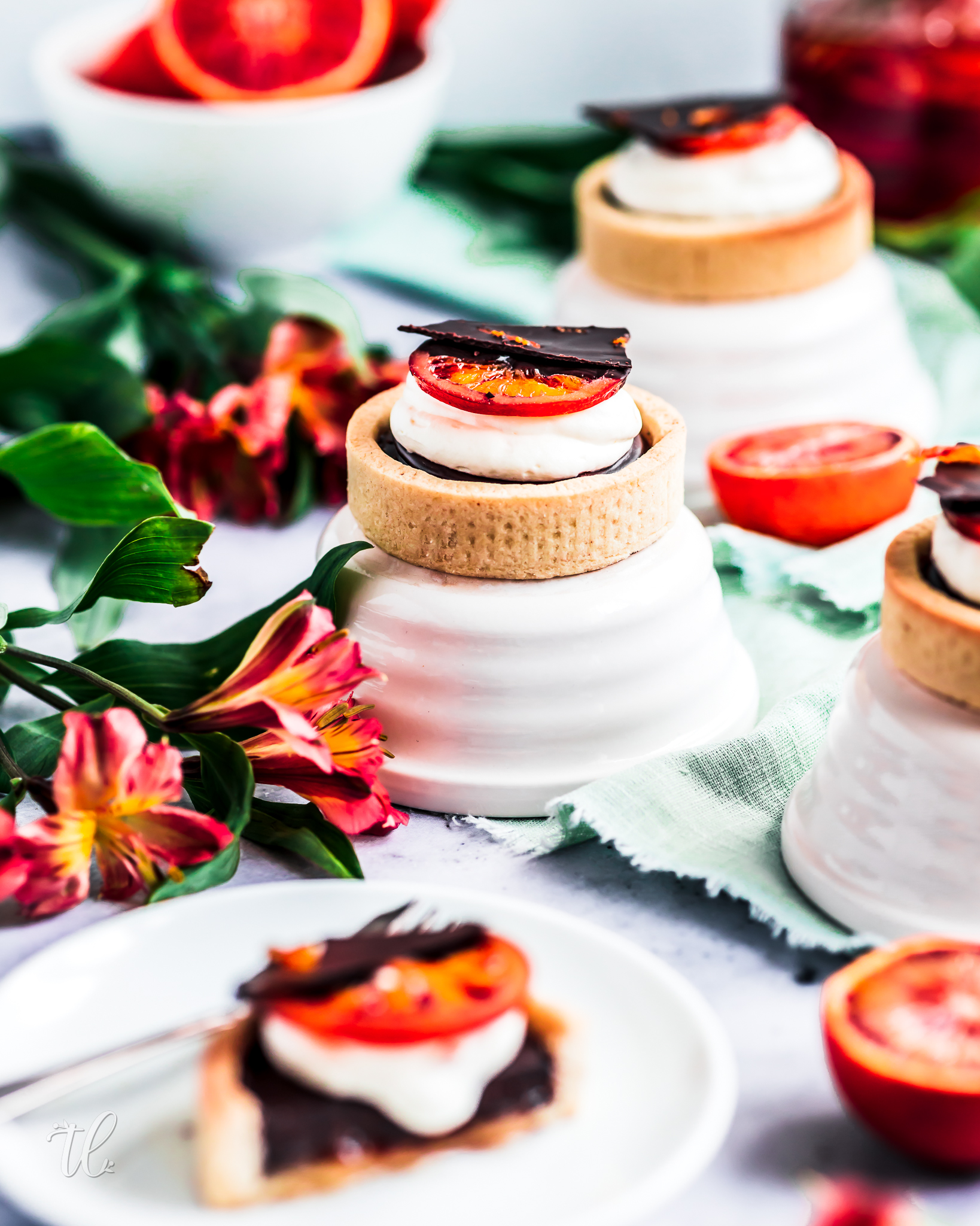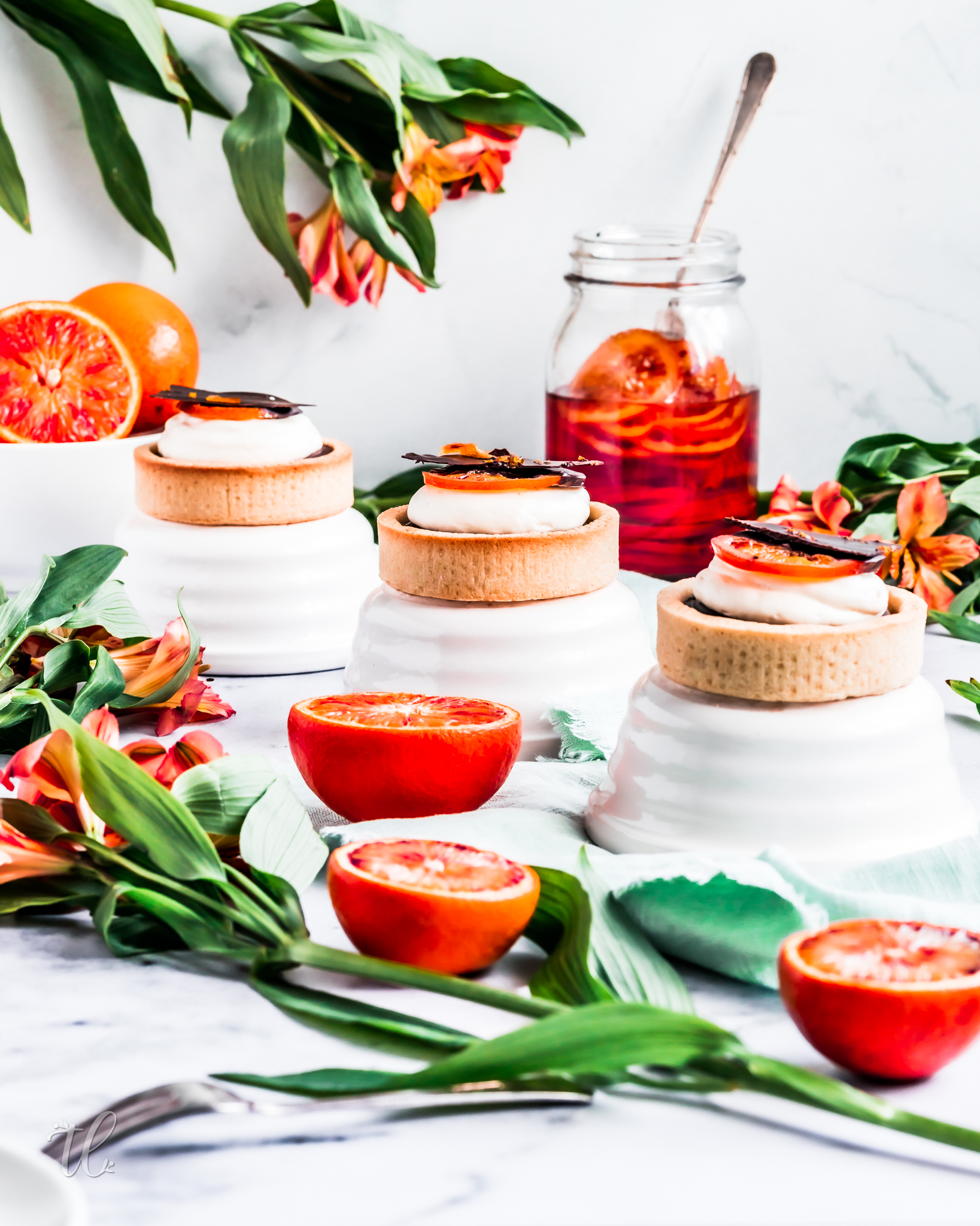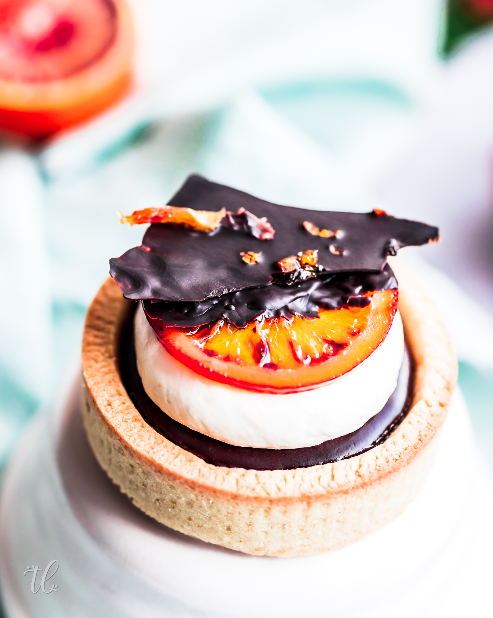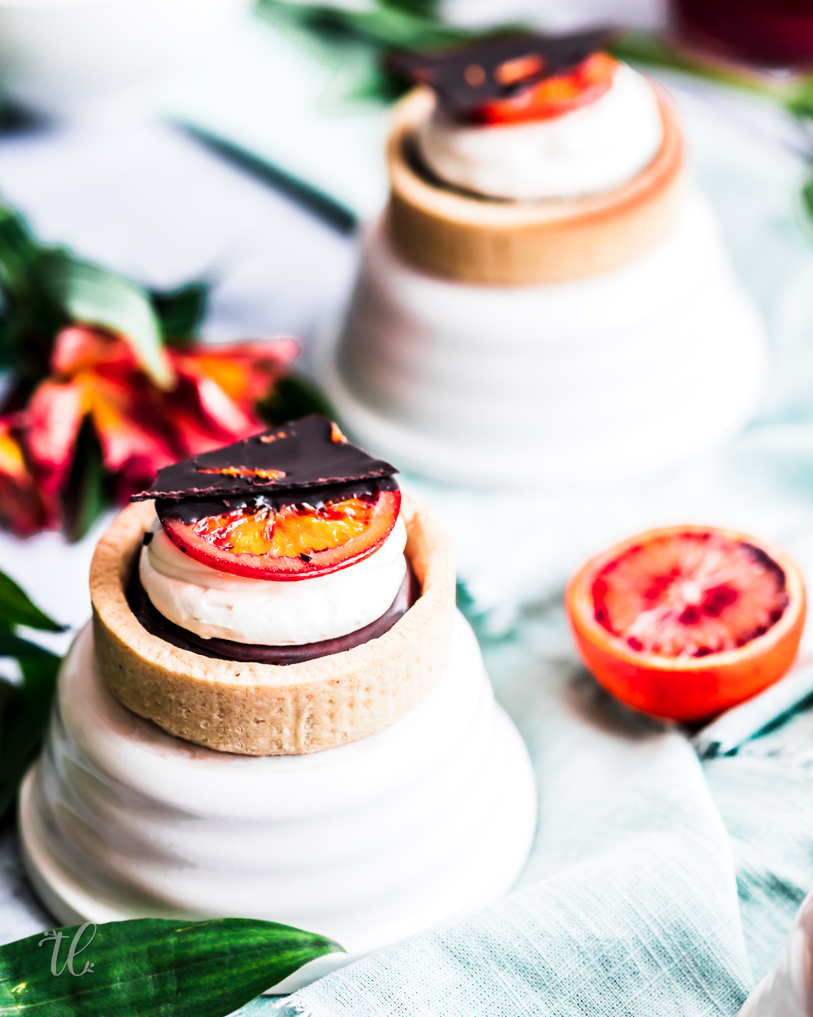 These tartlets are well worth the time. They have a short crumbly base, with a smooth punchy blood orange confiture, and a rich orange infused dark chocolate ganache. All of this is topped off with a light Chantilly cream.
