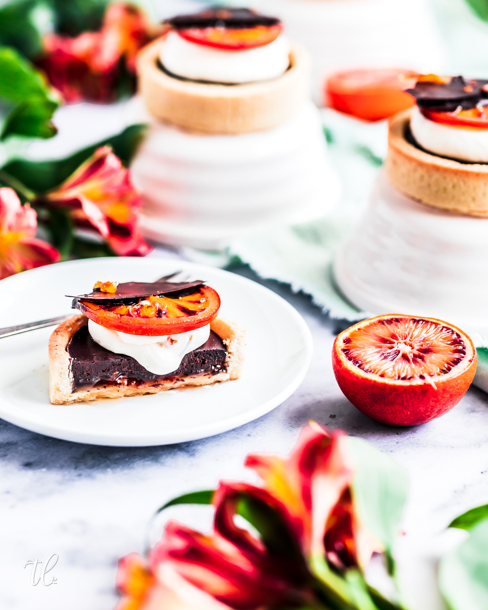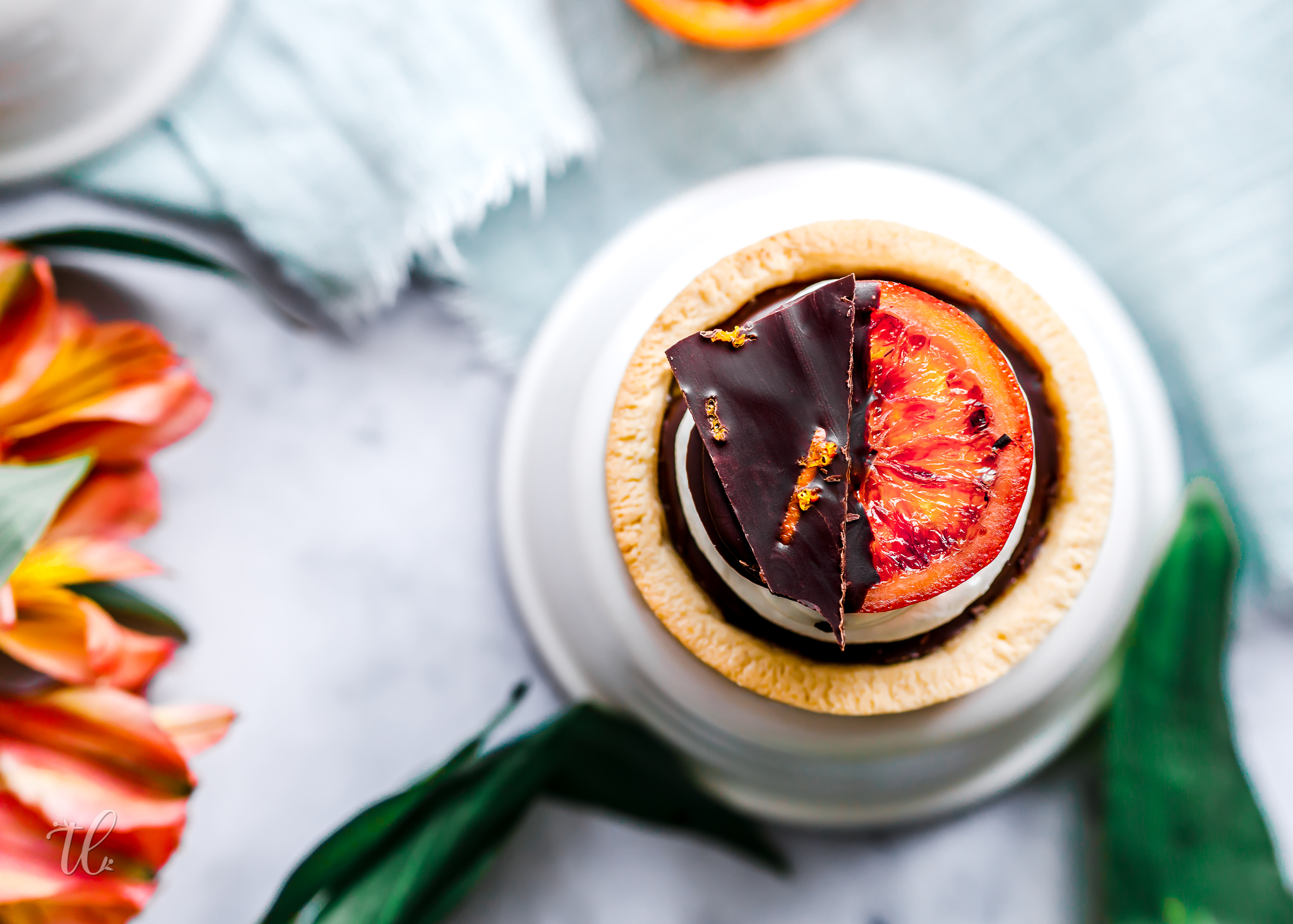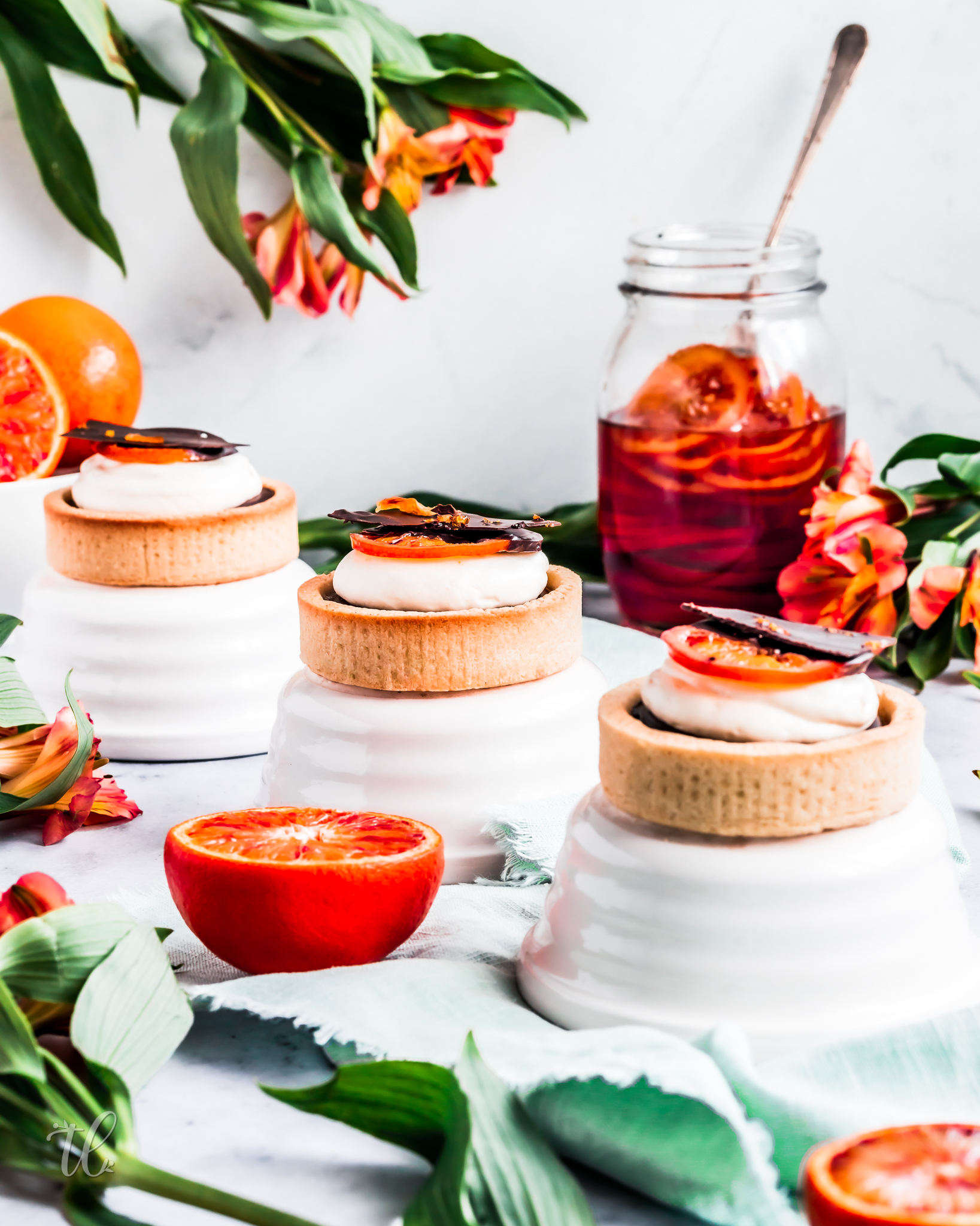 These tartlets are well worth the time. They have a short crumbly base, with a smooth punchy blood orange confiture, and a rich orange infused dark chocolate ganache. All of this is topped off with a light Chantilly cream.