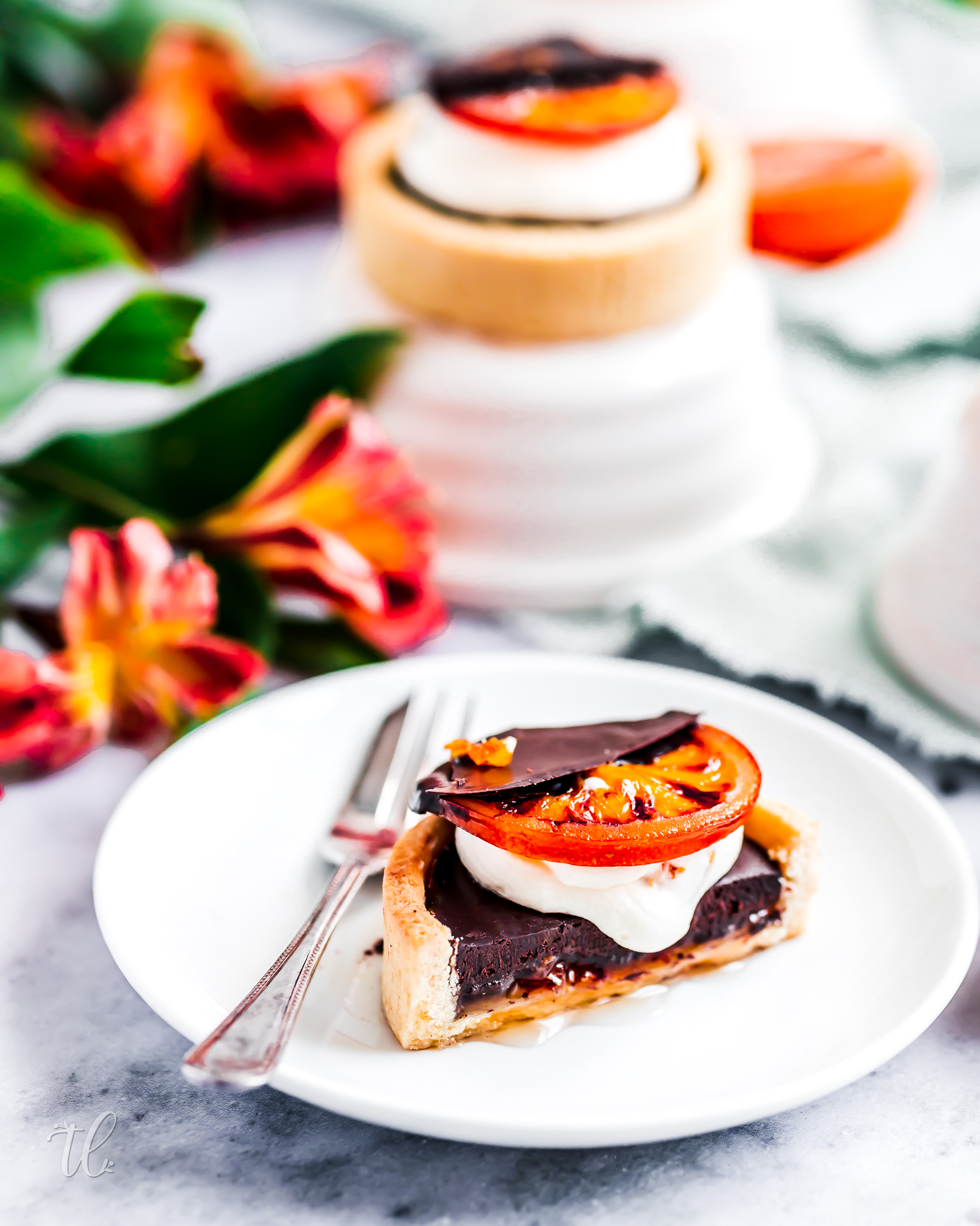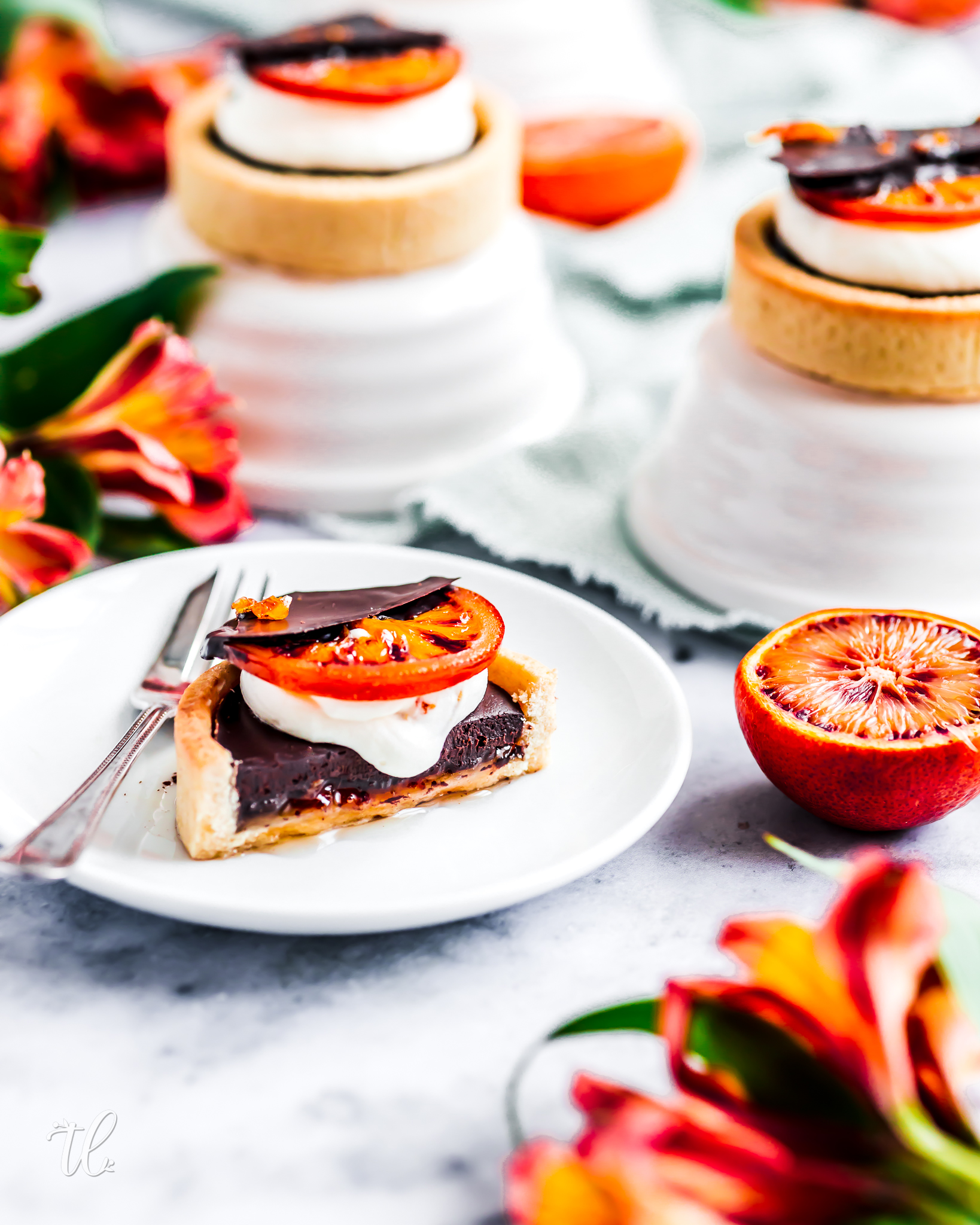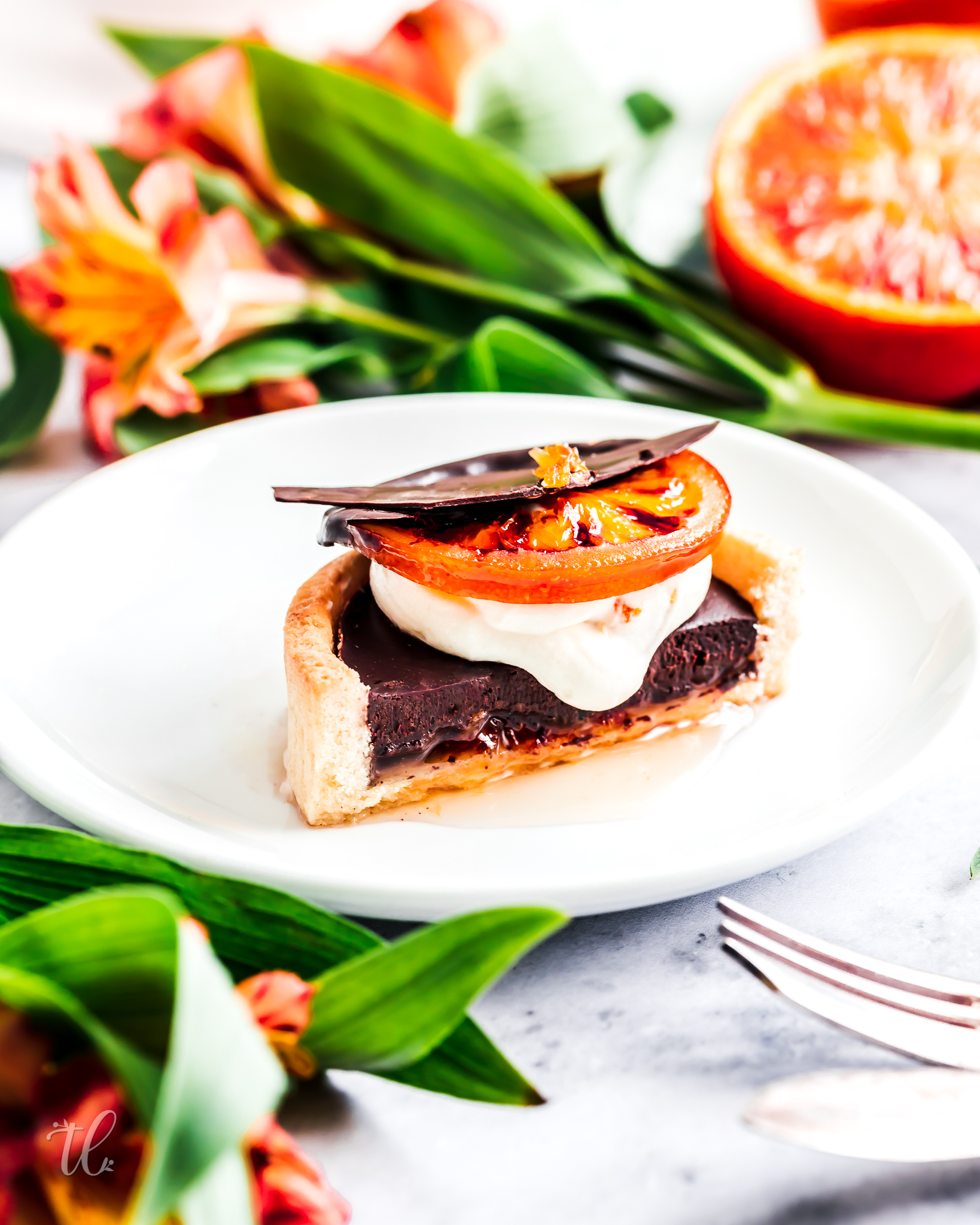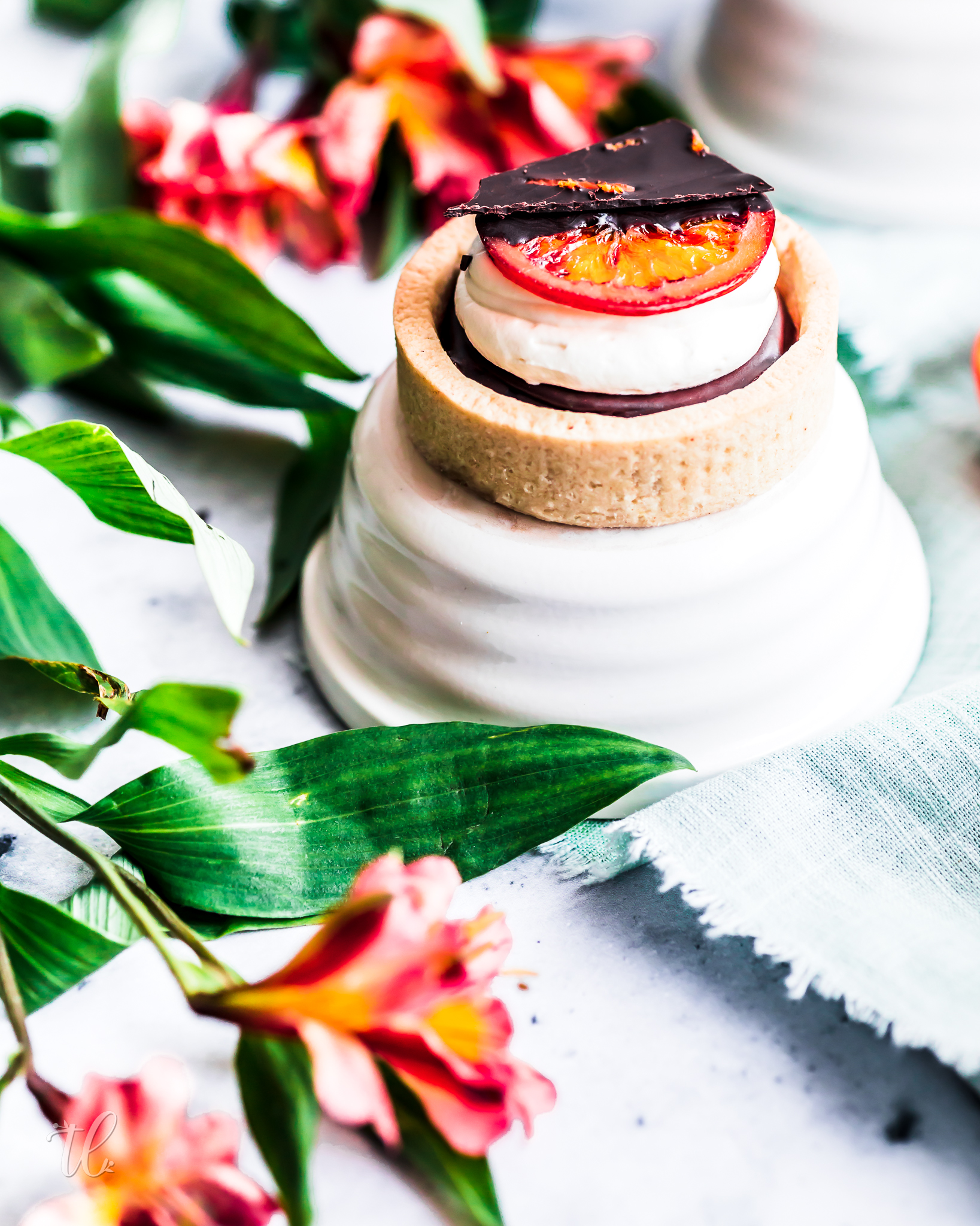 These tartlets are well worth the time. They have a short crumbly base, with a smooth punchy blood orange confiture, and a rich orange infused dark chocolate ganache. All of this is topped off with a light Chantilly cream.