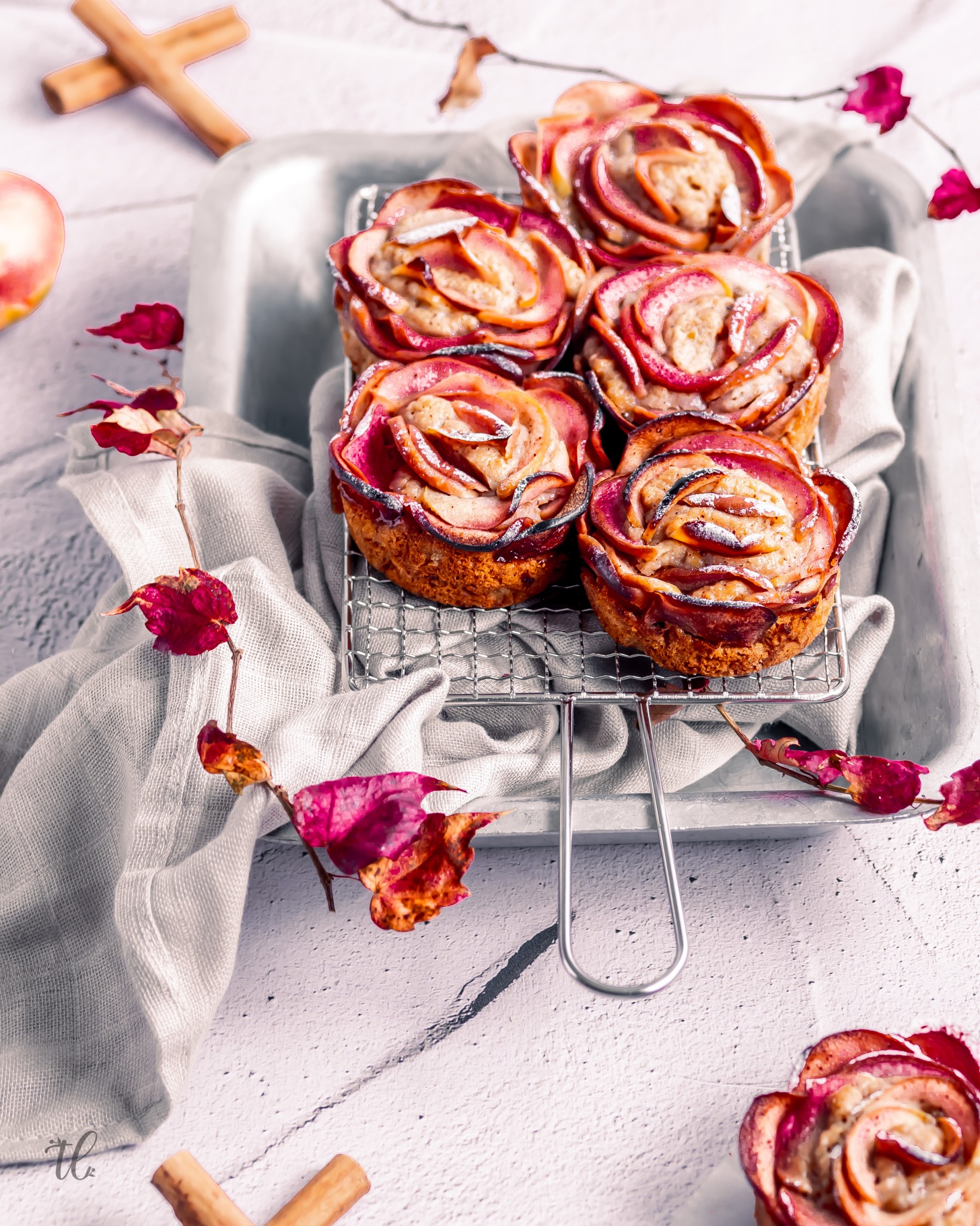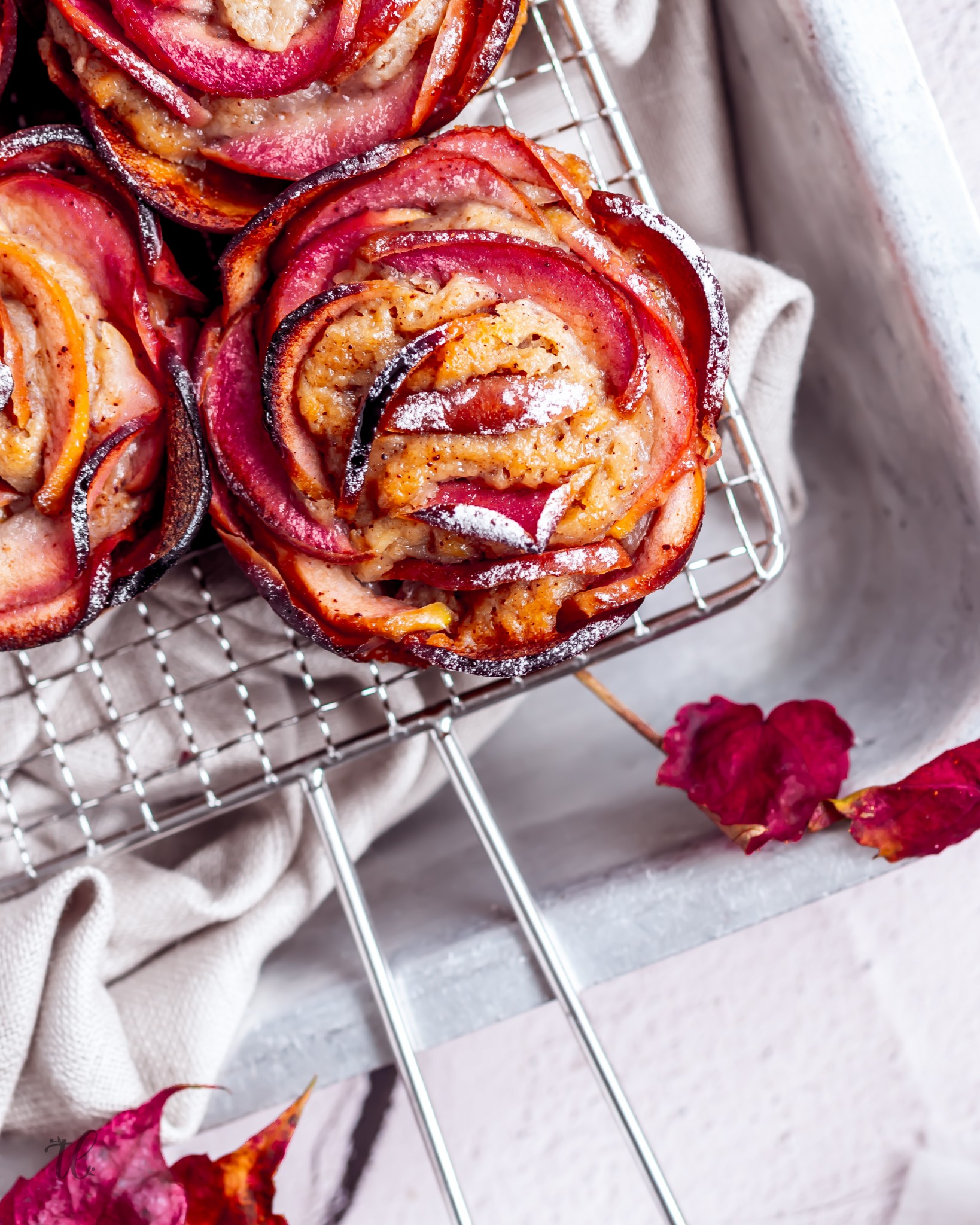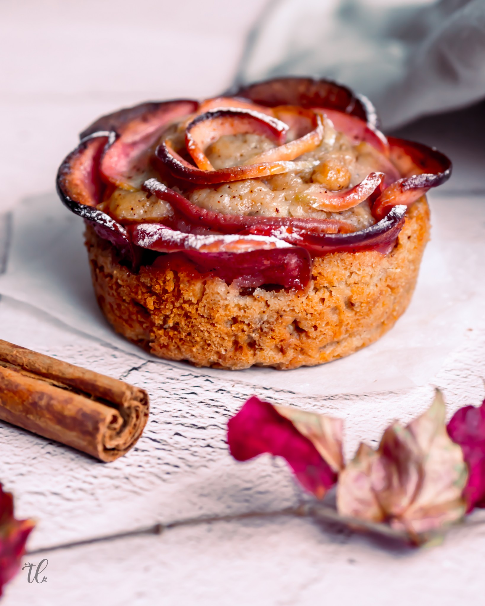 To showcase these kissabel beauties and capture the season, I created these vegan Cinnamon and Apple Rose Muffins. A simple but pretty, fall-inspired muffin recipe to make ready and enjoy fuss-free during your next stroll amongst fallen leaves.