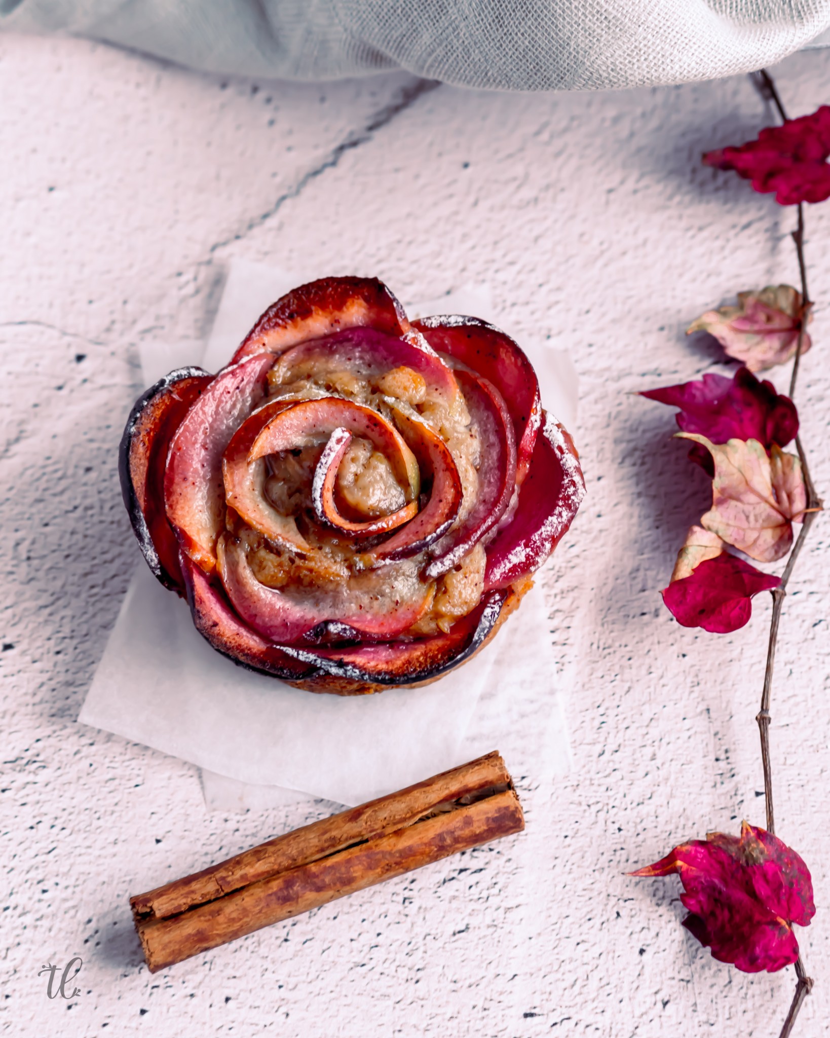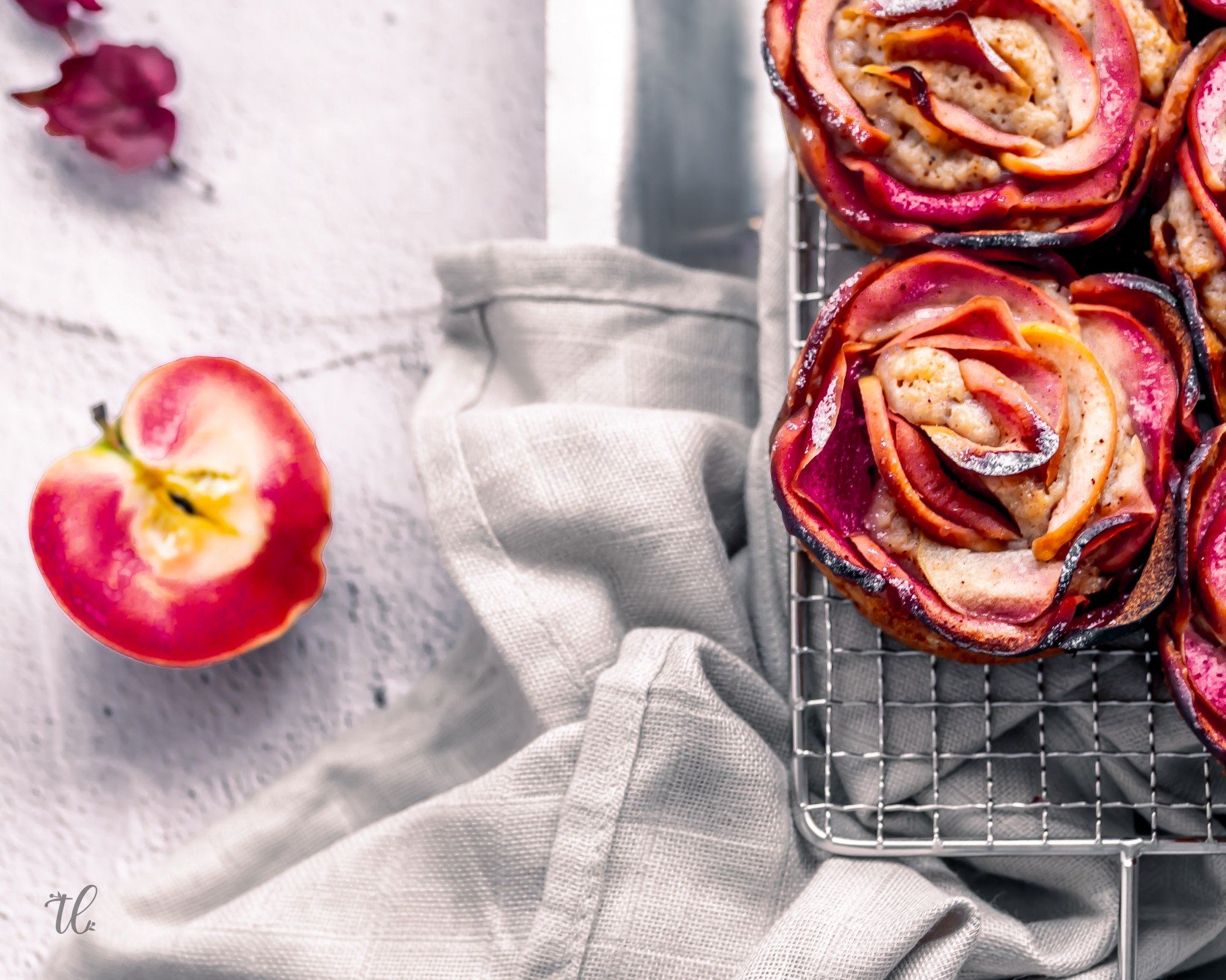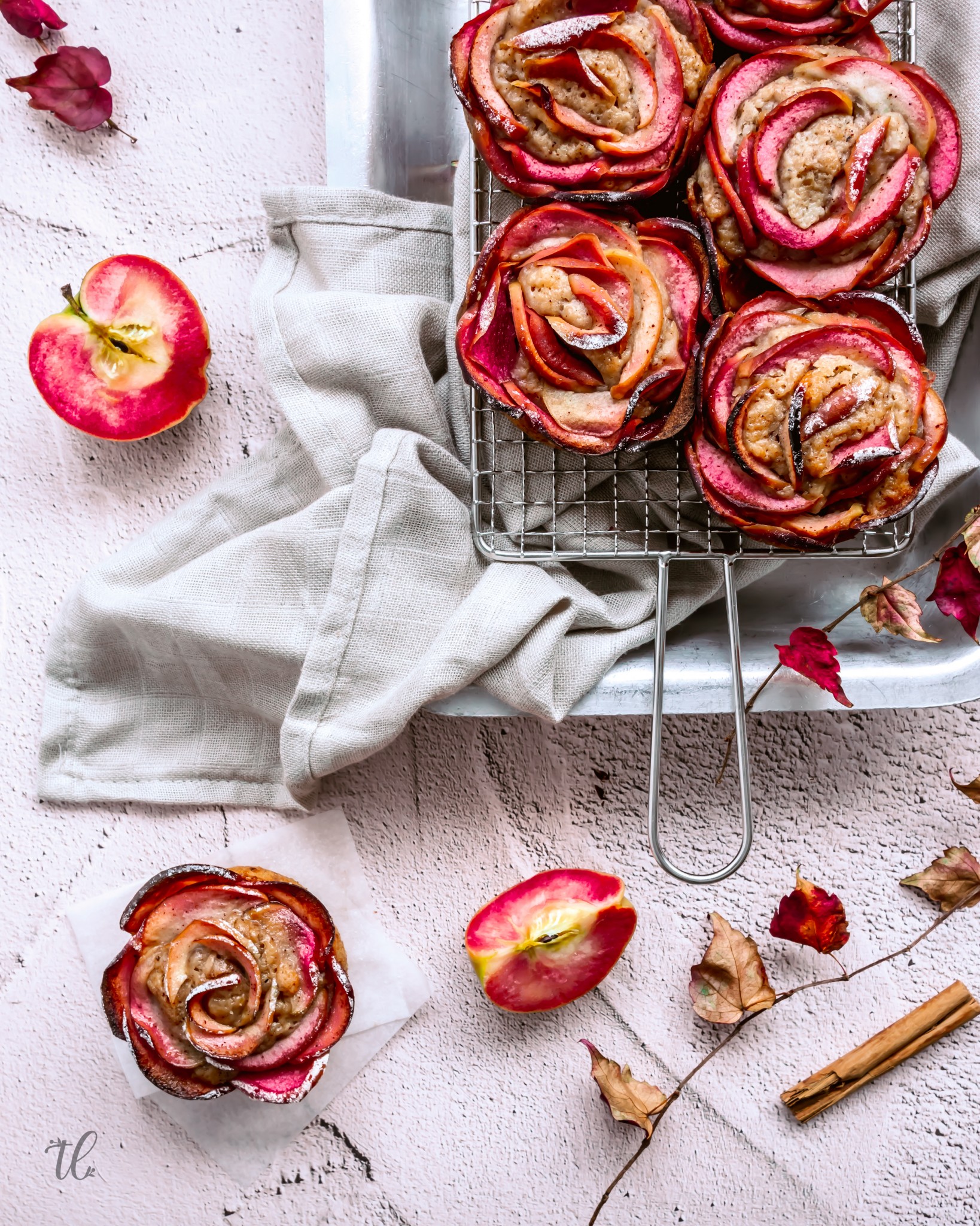 To showcase these kissabel beauties and capture the season, I created these vegan Cinnamon and Apple Rose Muffins. A simple but pretty, fall-inspired muffin recipe to make ready and enjoy fuss-free during your next stroll amongst fallen leaves.